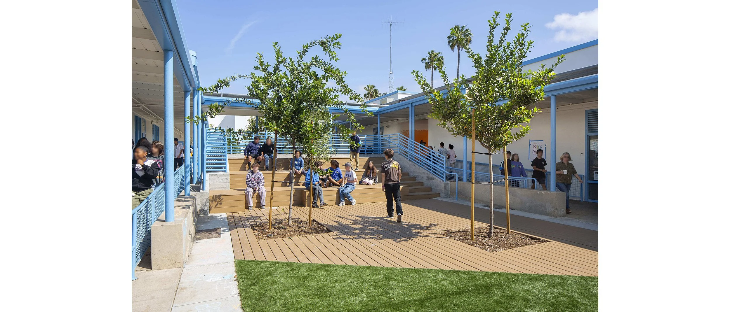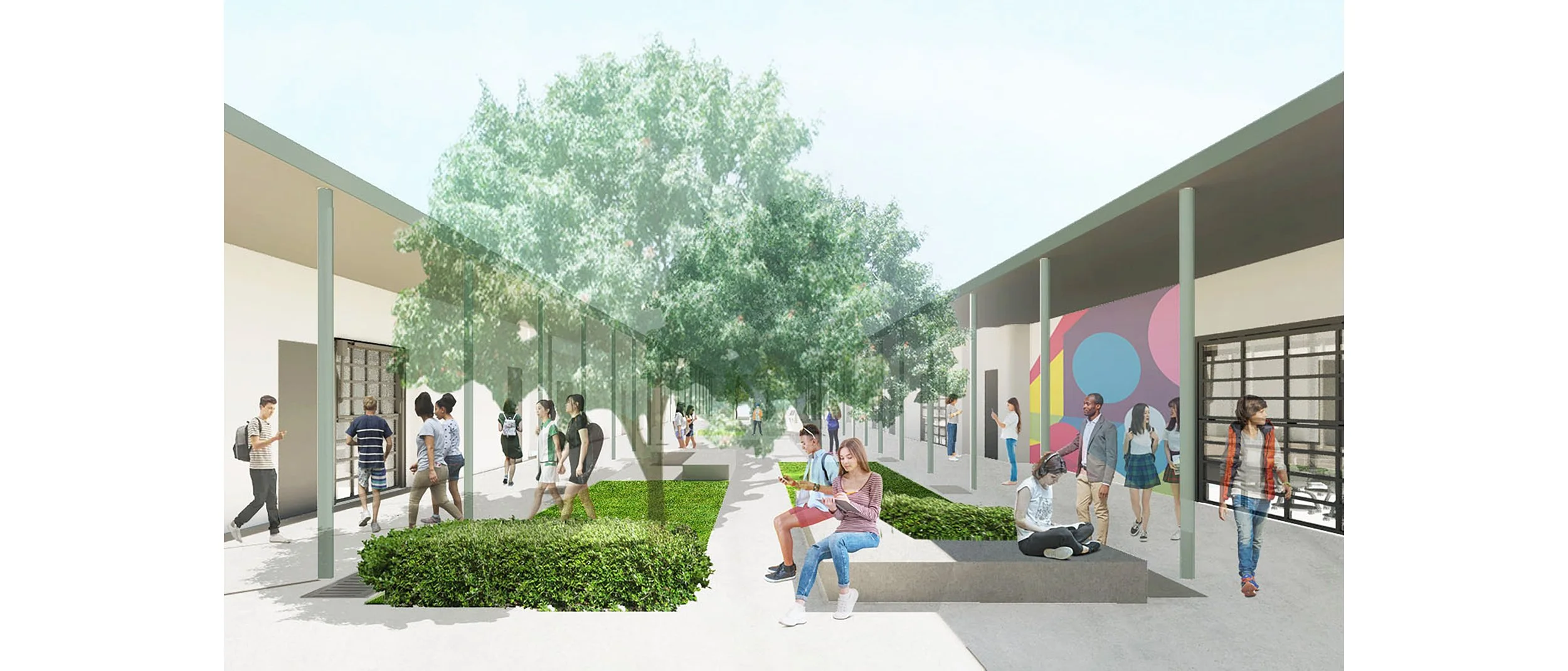 OotDL has been providing landscape planning and site design services on projects on the campus for over four years, starting with the development of updates to the campus master plan. The first project to be realized was a linear flexible gathering and casual space between existing classroom buildings. The renovated space introduces a diverse palette of native and climate-adapted tree species to provide shade for outdoor gatherings or more formal outdoor learning.