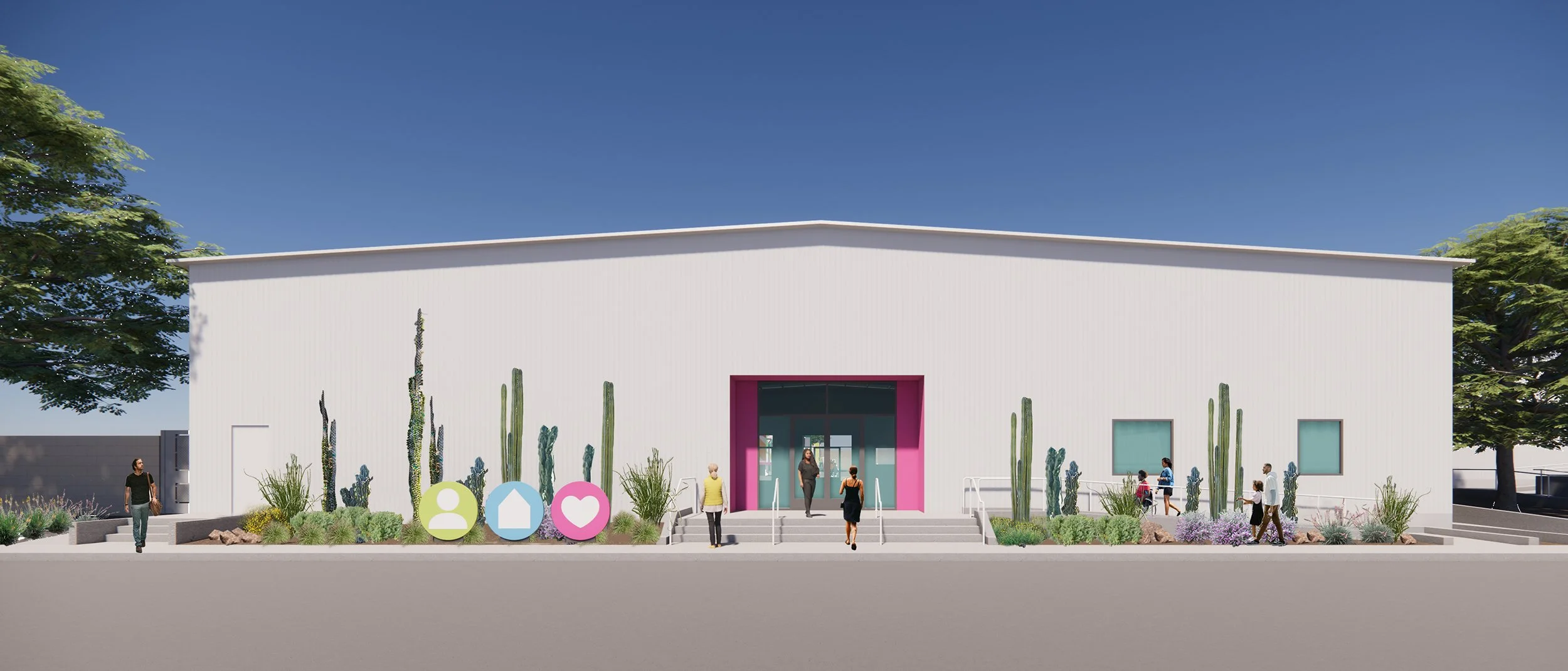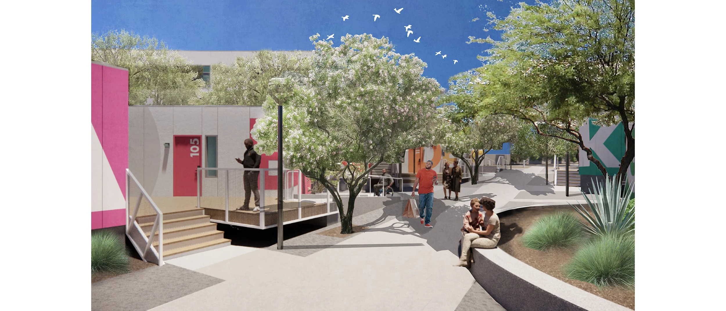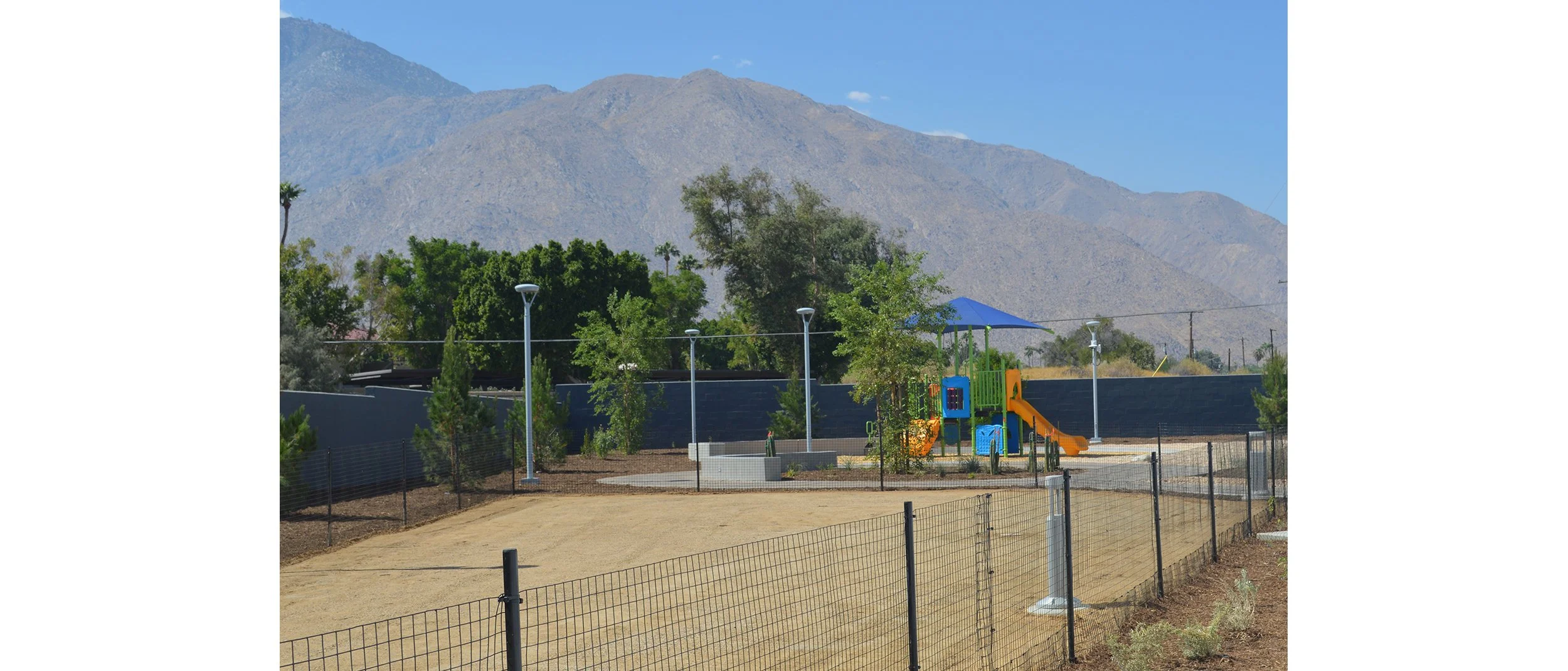 OotDL provided full landscape architecture services for a 3.7 acre former industrial property to house critically needed housing and support services in the Coachella Valley. This fast track project included the renovation of existing industrial buildings and the construction of multi story prefabricated housing for unhoused individuals and families. The site is adjacent to existing light industrial and commercial uses on two sides and residential properties on the other perimeters. No existing vegetation was present on site, but dramatic views of the desert mountains provided inspiration for the site organization. The goals for the landscape design included design of a street frontage to instill community pride in the facility, to soften views of the multi story buildings from outside of the site, and to create gardens and recreation areas for residents that will encourage social connections and community. A central promenade flanked by native desert and adapted plants leads from the community support spaces to the children’s garden and dog run in the upper portion of the site. Trees throughout the site will provide shade for outdoor activities, cool the buildings to reduce energy use and reduce heat island in the parking lot.