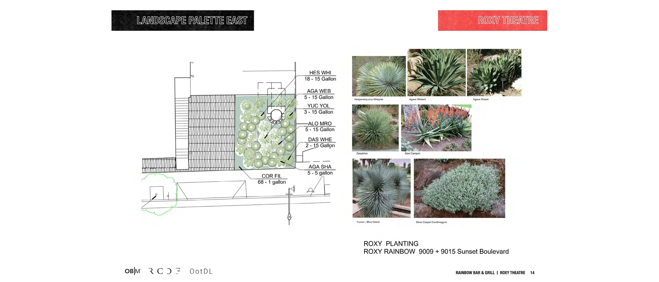 OotDL is providing design services for the creation of a dining courtyard and gardens for the historic Roxy nightclub and Rainbow Room grill. The origin of the project is the installation of one of the City of West Hollywood’s high tech billboards adjacent to the Roxy. The courtyard and garden design seek to maintain the somewhat gritty character of the rock and roll iconic venues while providing opportunities for expanded use outdoors.